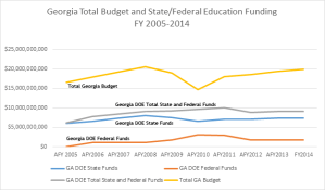 I put together a spreadsheet for you so you can see Georgia’s spending on education from Fiscal Years 2005 through the current Fiscal Year 2014. I have graphed Georgia’s education spending, the federal money Georgia spends on education and the total budget for our state.